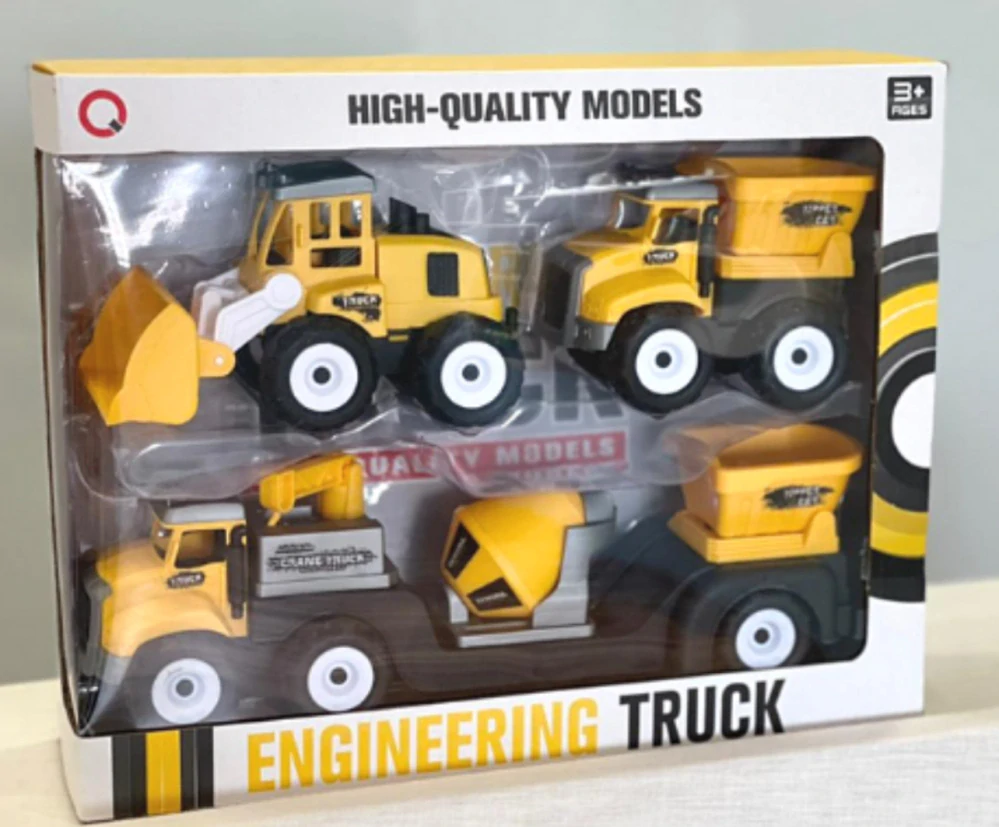 2 plastové stavební stroje s přívěsy a nákladem.
