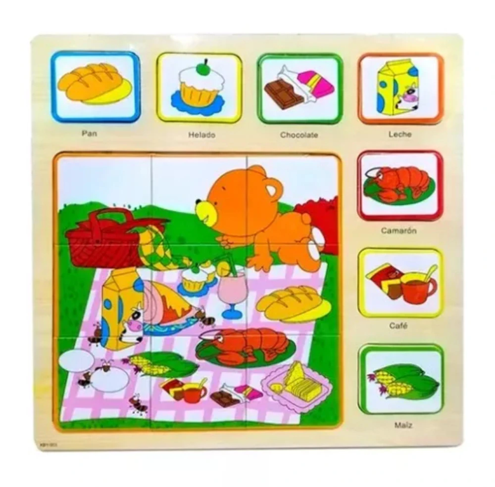 Dřevěné vkládací puzzle s obrázky dobrot z Méďova pikniku v trávě