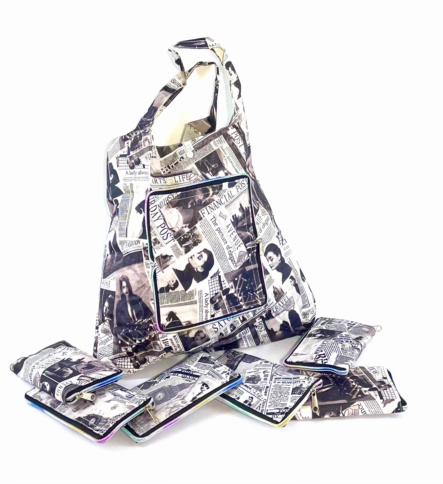 - Nákupní taška skládací se zipem pevná, retro noviny