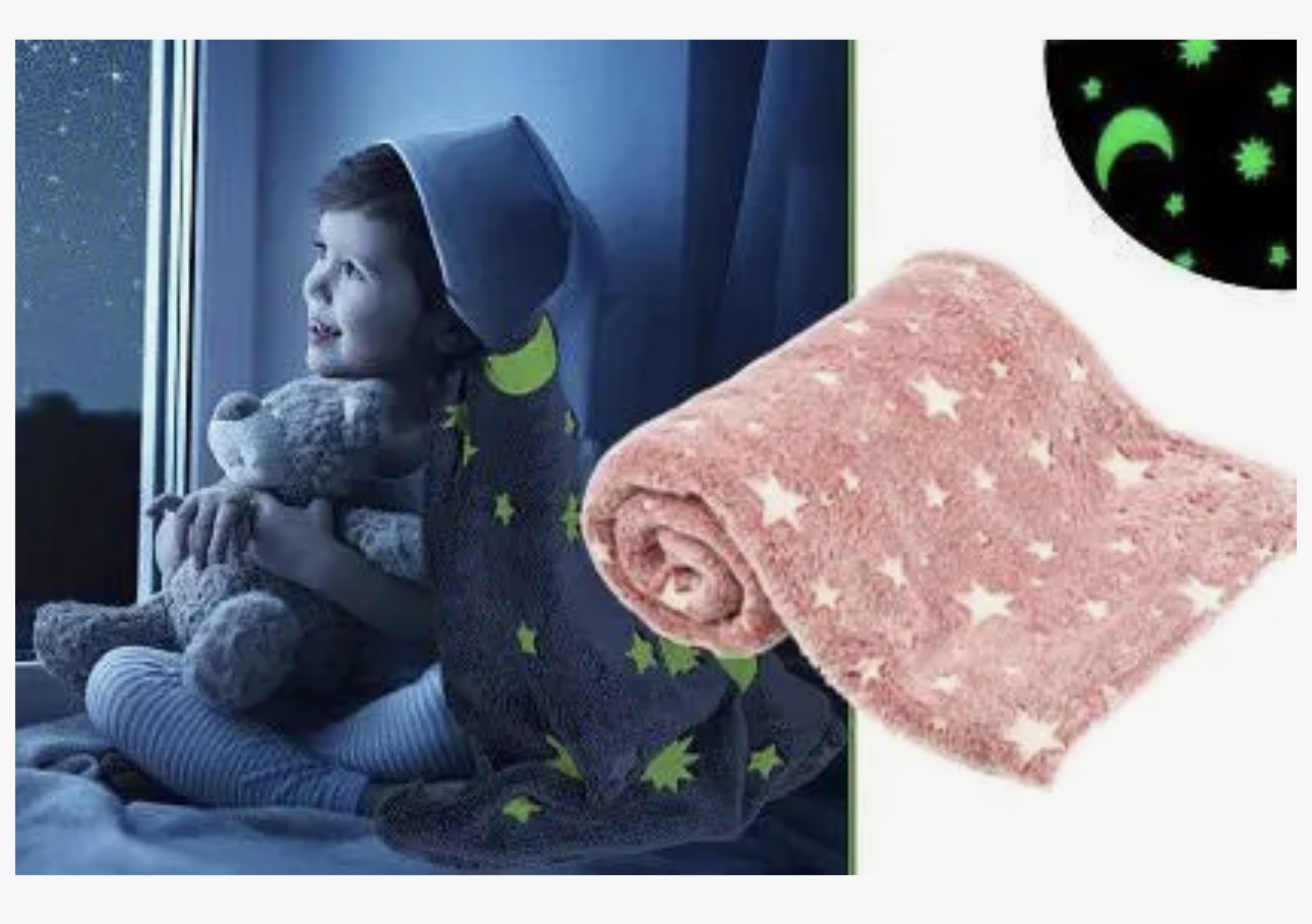 Dětská fleecová deka Magic Glow in the Dark přináší kouzlo noční oblohy přímo do dětského pokoje. Je zdobena motivy hvězd, planet, měsíců a dalších vesmírných tvarů, které po nasvícení svítí ve tmě a vytvářejí uklidňující atmosféru ideální pro usínání.
