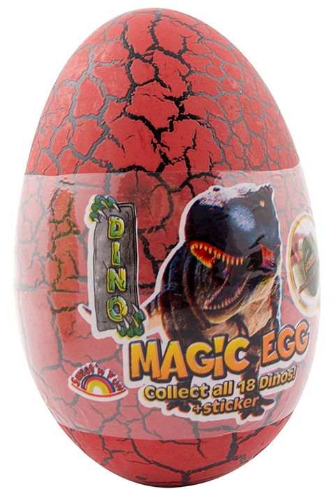 Dino Magic Egg Surprise Egg obsahuje dinosauří vajíčko, samolepku a figurku dinosaura uvnitř. Vejce je k dispozici v různých barvách a s různými figurkami dinosaurů a také samolepkami, které vejce dostanete, je náhodné.