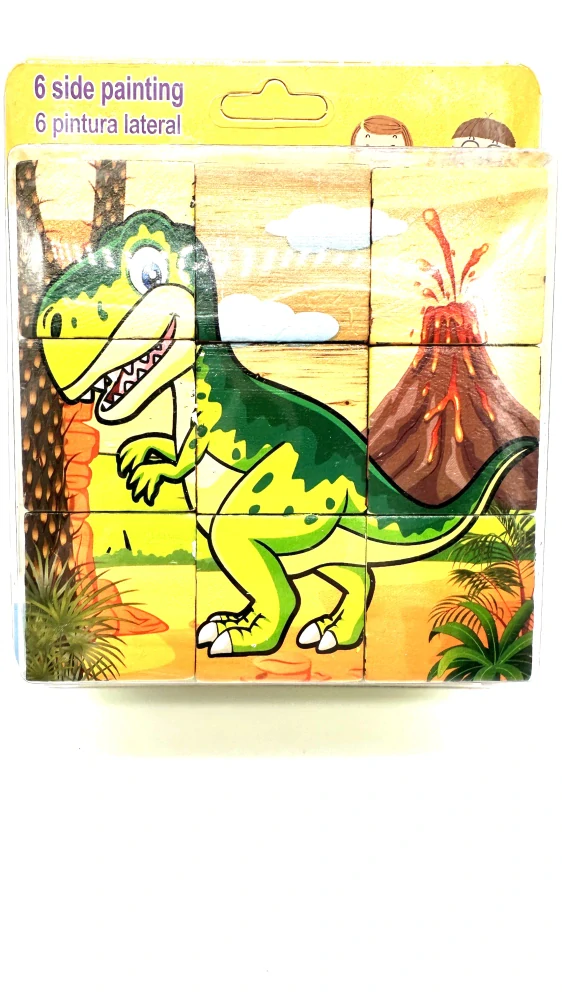 Z 9ti kostek může vaše dítě sestavit 6 různých obrázků- Brontosaurus, lev, medvěd, tygr, papušek, kůň.