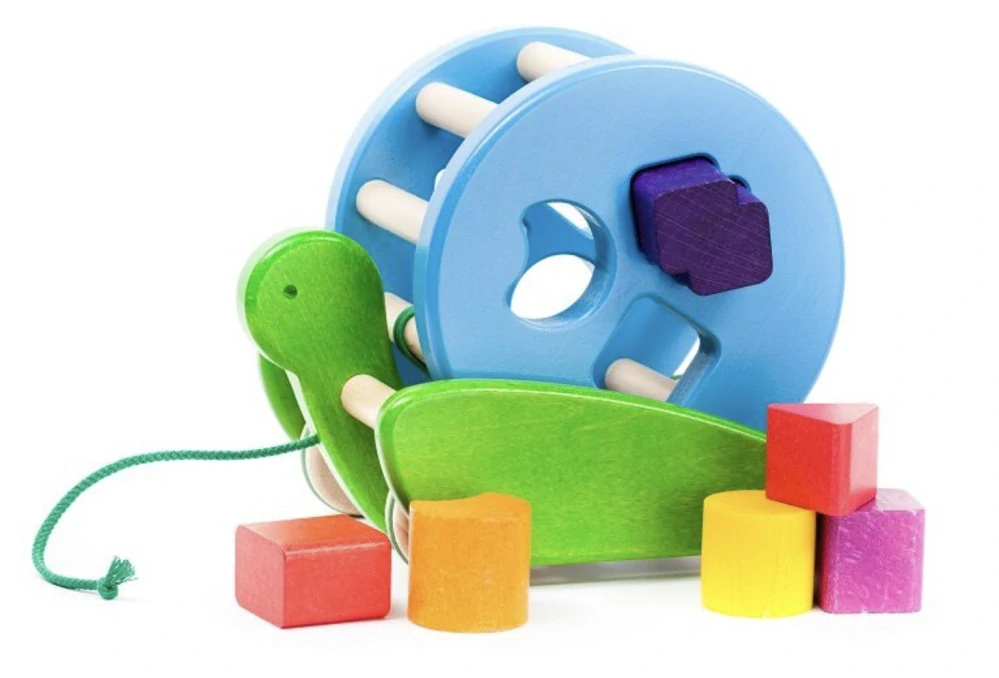 Šneci putují se svými domečky na zádech. Tento dřevěný šnek je zvláštní případ. Nese domeček s kostkami, který se otáčí při pohybu. Když se otáčí, kostky pak klepají a vydávají zvuky. Hračka má dvě funkce. Je to třídič i tažné zvíře. Jeho ulita je vybavena 6 tvary a 6 otvory, lze ji vyjmout a nasadit a na přední straně má šnek provázek. Hra s hlemýžďem poskytuje mnoho vzdělávacích výhod. Třídění učí rozpoznávání tvarů a barev, rozvíjí manuální dovednosti a podporuje rozvoj jemných motorických dovedností, zlepšuje vizuálně-motorickou koordinaci. Schopnost táhnout hračku za sebou však podporuje rozvoj hrubých motorických dovedností.