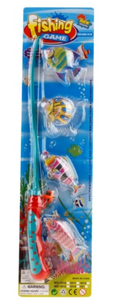 Rybářská herní sada obsahuje plastový prut s háčkem, 4 roztomilé barevné plovoucí rybky a podběrák.