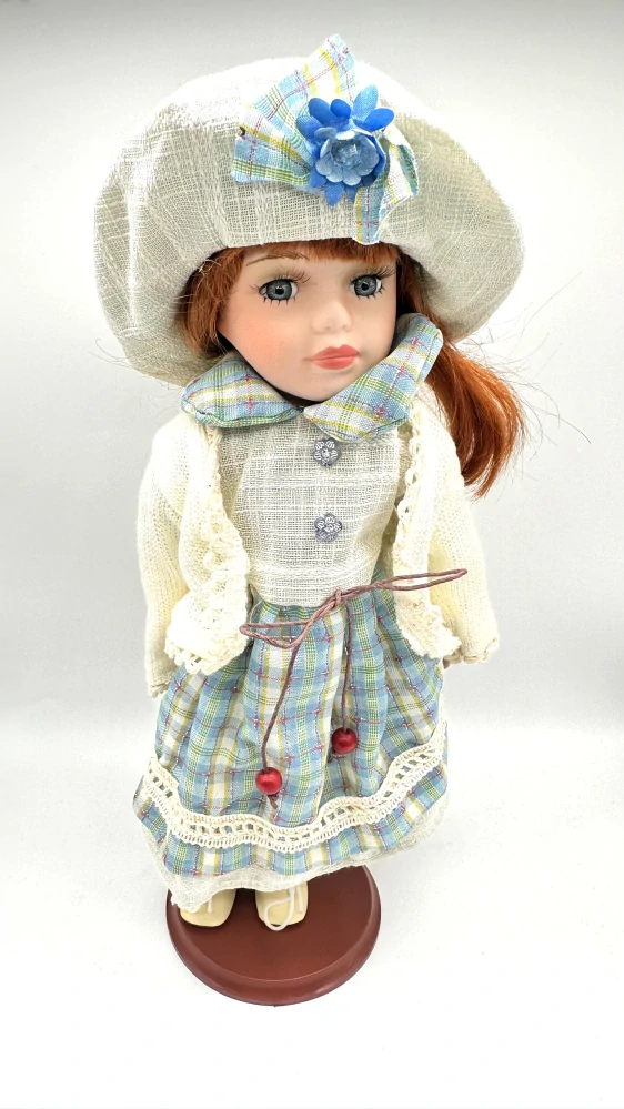 Panenka byla vyrobena z porcelánu, je vysoká 30 cm a má světle hnědé vlasy.