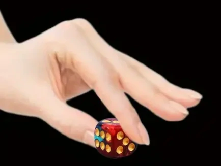 Červená zeleně žíhaná hrací kostka se zlatými puntíky.