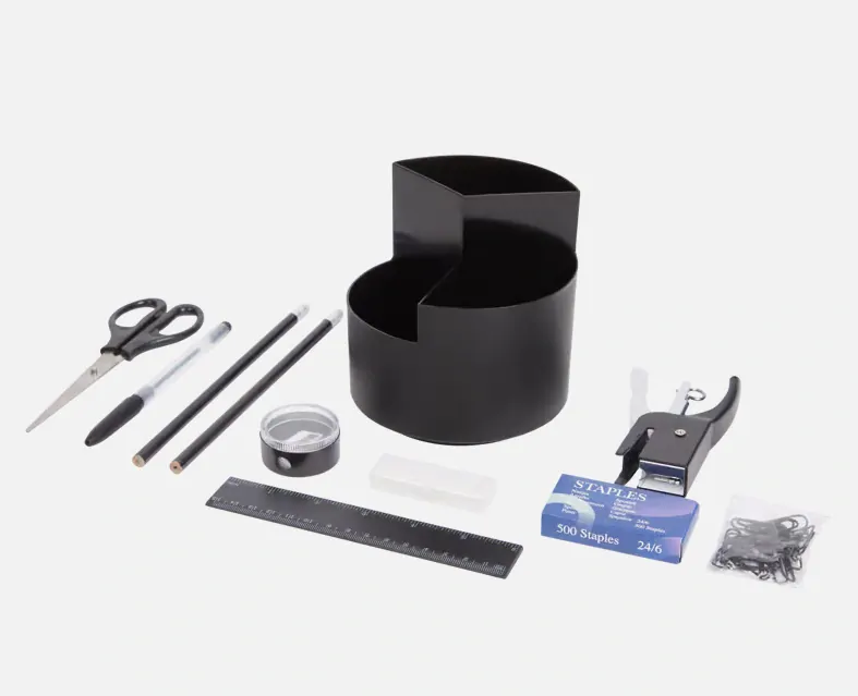 Tato praktická sada obsahuje 2 tužky, 1 nůžky, 1 pero, 1 pravítko, 1 ořezávátko, 1 gumu, 1 balení kancelářských svorek, 1 sešívačku a 1 balení sponek do sešívačky a 1 organizér.