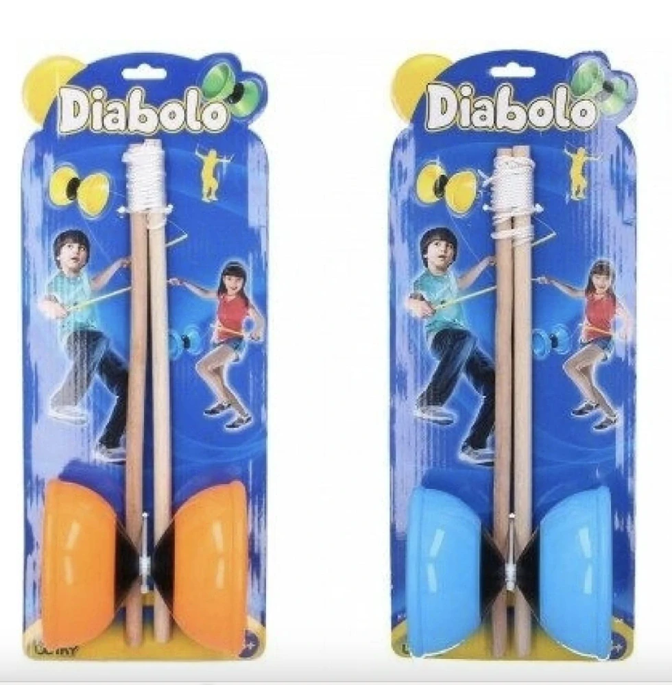 Diabolo se skládá ze dvou plastových polokoulí spojených tenkým kovovým středem. Žonglér, který drží v rukou dřevěné hůlky by měl na provázku cívku roztočit a dělat různé triky. Hračka ve čtyřech barevných variantách. Baleno na kartě.