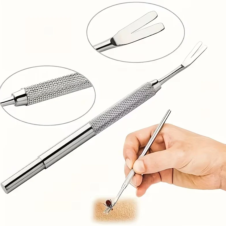 Nerezová přesná vidlička pro bezpečné odstranění parazitů z kůže domácích mazlíčků.
